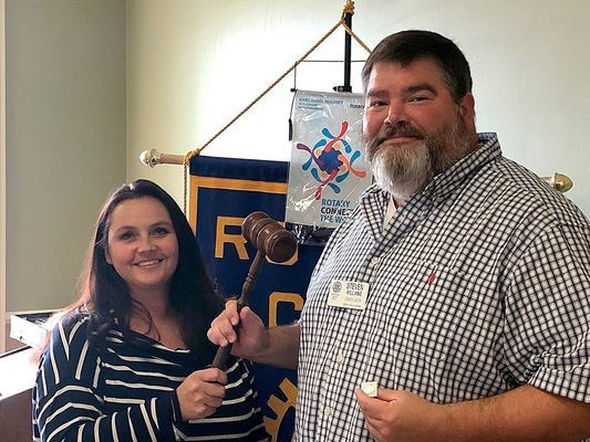 Hickman Rotary Club Secretary Kristy Travis, left, presented the 2020-21 President’s pin and gavel to the new Hickman Rotary Club President, Steven Williams, left, on June 26. Williams will lead the Hickman Rotary Club for the upcoming year. Tony Grogan, not pictured, was named President-elect and will follow Williams after his term ends June 30, 2021. Any interested in joining the Hickman Rotary Club should contact any club member or attend a meeting at noon on Thursdays in the community room at The Citizens Bank in Hickman. (Photo submitted)