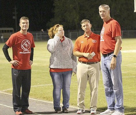 Jamie Knott, second from left, becomes emotional, after the announcement of community donations were presented to her husband, South Fulton football coach Eric Knott (second from right). The donations, in the amount of approximately $2,900, were presented by Red Devils Booster Club president Tim Britt, far right, and vice-president Jordan Barnes, far left, during Friday nights game. The funds were collected through the sale of #StrongAsAKnott t-shirts, along with individual contributions. The monies were raised to help with expenses for the Knott family, due to recent cancer treatments for Coach Knott in Memphis, Tenn. (Photo by Charles Choate)